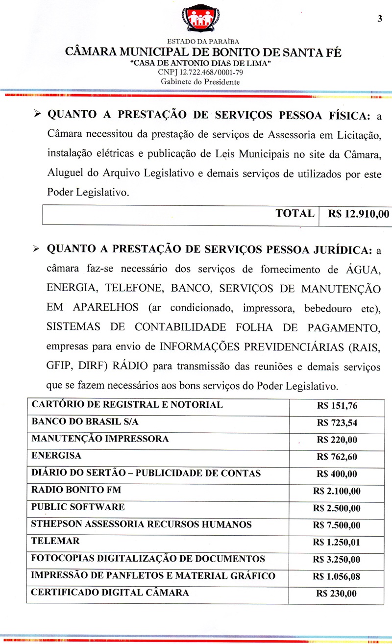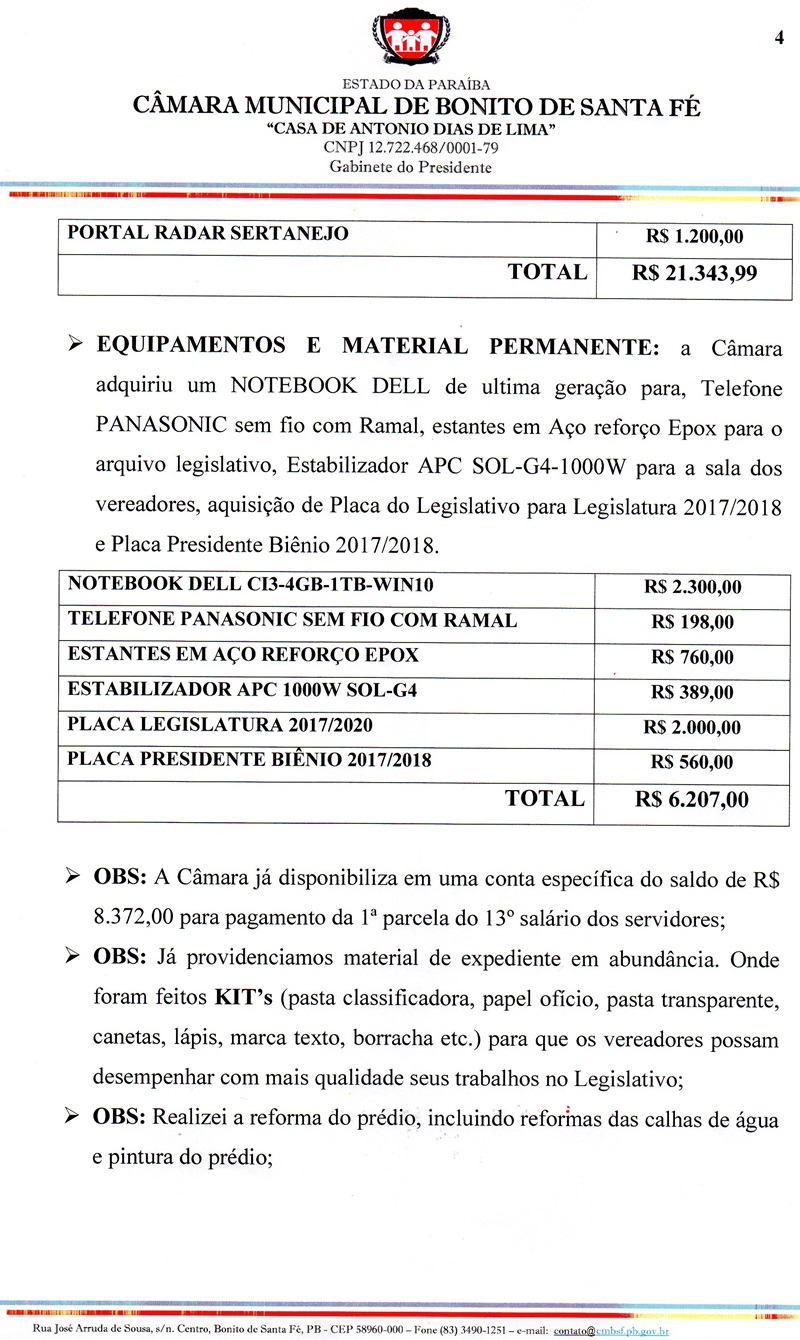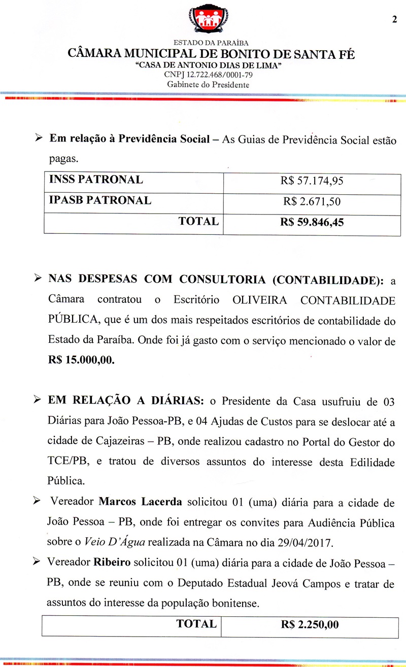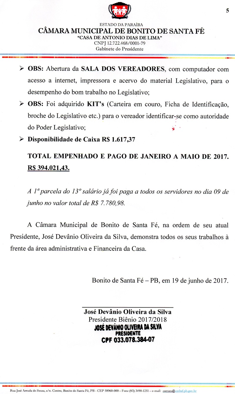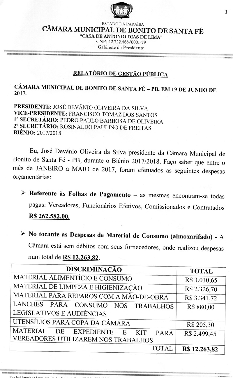 Pelo terceiro mandato consecutivo, o vereador José Devânio Oliveira, mais conhecido como Van do Viana (PTB), presidente da Câmara Municipal de Bonito de Santa Fé, demonstra seu compromisso com a transparência da sua gestão frente ao Poder Legislativo bonitense ao tornar públicos, na internet e na imprensa, os relatórios de despesas e ações da Câmara.