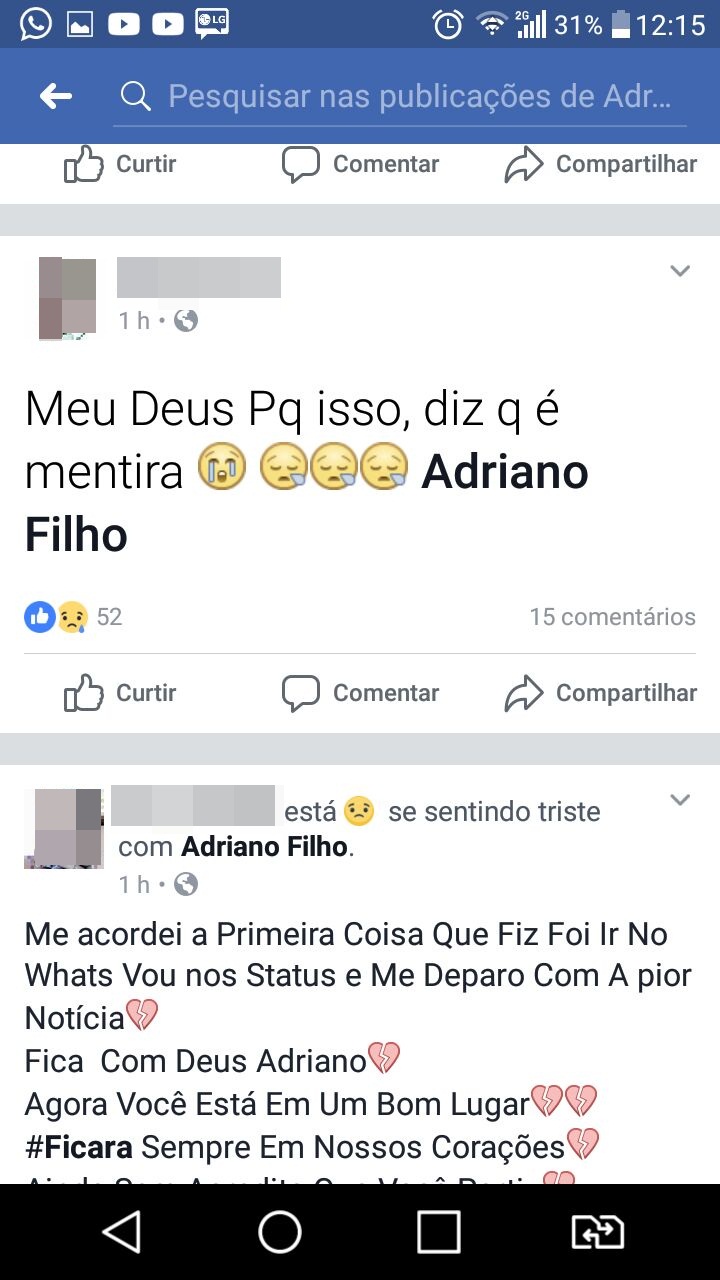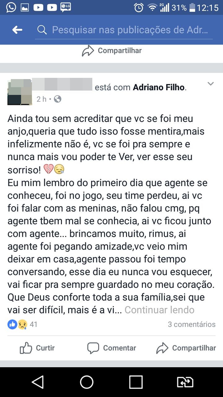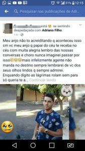 No Facebook de Adriano, familiares e amigos postaram mensagens de despedida e dor pela partida prematura do jovem.