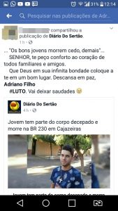 As redes sociais ficaram rapidamente repletas de mensagens de pesar a família do jovem Adriano Filho, 20 anos, vítima de acidente de moto na BR 230, em Cajazeiras.
