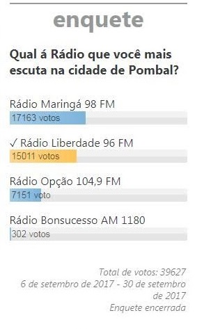 Em enquete realizada nos portais Diário do Sertão e Show Diário, entre os dias 6 e 30 de setembro deste ano, mais de 39 mil cliques foram registrados, opinando sobre a rádio mais ouvida na cidade de Pombal, no Sertão da Paraíba.