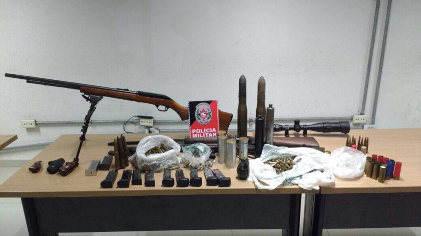 Em um quartinho que ficava por trás da residência apontada, os PMs encontraram, no fundo falso de um guarda-roupas, duas espingardas, um rifle, uma pistola e centenas de munições, incluindo munições de fuzil calibre 556, 762 e .50, e também de morteiro, um armamento utilizado em combates de guerra, além de uma granada. O antigo morador do quarto seria um ex-militar que teria falecido há alguns meses.