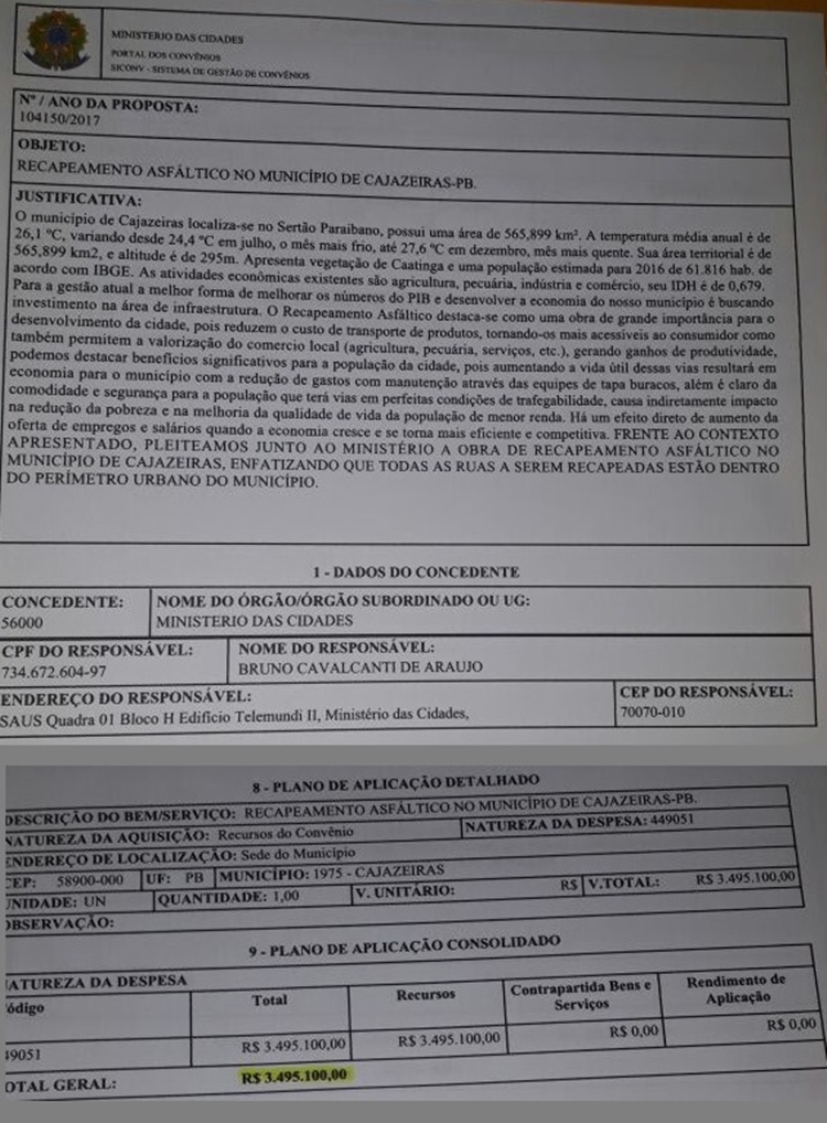 Emenda Parlamentar Nº 104150/2017 destinada ao recapeamento asfáltico da cidade de Cajazeiras