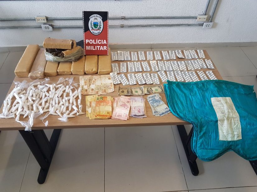 A maconha estava dividida em 7 tabletes grandes e em mais 4 de tamanhos menores. 120 pinos de cocaína e 40 cartelas com comprimidos artane também foram apreendidos pelos policiais. A PM localizou ainda mais de R$ 800,00 e dois dólares. Todo o material e os suspeitos presos foram levados para a Central de Flagrantes, no bairro do Ernesto Geisel.