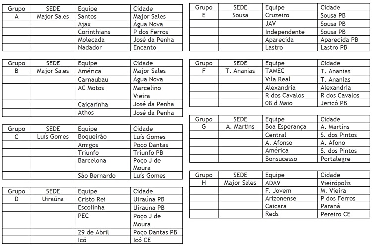 O Independente é o atual campeão do Campeonato Municipal de Sousa da primeira divisão. Já a equipe do Lastro foi a vice-campeã do campeonato municipal da primeira divisão de Sousa. O JAV de São Gonçalo também é uma boa equipe e pode surpreender na Copa. Já time de Aparecida é estreante na competição.