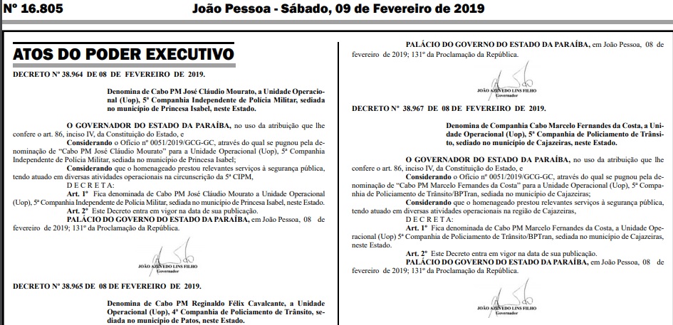 Na edição do Diário Oficial do Estado da Paraíba deste sábado(09), o governador João Azevêdo via decreto denominou oficialmente a Unidade Operacional (Uop) da 5ª Companhia de Policiamento de Trânsito/BPTran na cidade de Cajazeiras com o nome do Cabo da Polícia Militar Marcelo Fernandes da Costa, que faleceu no ano em outubro de 2016, aos 36 anos, após sofrer um grave acidente de trânsito.