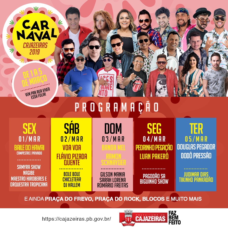 A Prefeitura Municipal de Cajazeiras anunciou na tarde desta sexta-feira(08) na sede da Secretaria de Cultura e Turismo, a programação do Carnaval 2019 em Cajazeiras. Entre as atrações, destaca-se a Banda Mel, além de músicos da região. O Carnaval 2019 em Cajazeiras terá, ainda, desfiles dos tradicionais blocos da cidade, Praças do Frevo, do Rock, do Beco e Festival de Marchinha.