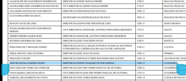 Dentre as nomeações, na cidade de Cajazeiras apenas um cargo foi anunciado, o de diretor da Escola Estadual Joaquim Victor Jurema, quem assumirá o colégio será José de Sousa Almeida Filho.