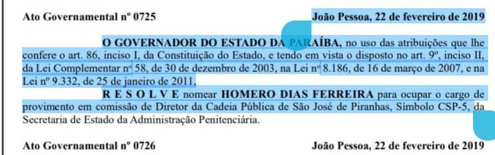 Já para a cidade de São José de Piranhas a mudança aconteceu na direção da Cadeia Pública, quando o governador exonerou, a pedido o servidor Edson Martins da Silva.