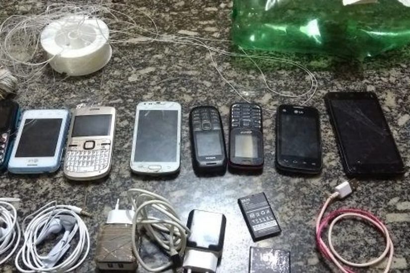 Segundo informações da PM, foram apreendidos oito telefones celulares, dois fones de ouvido, dois carregadores e duas baterias, que estavam armazenados dentro de uma garrafa PET.