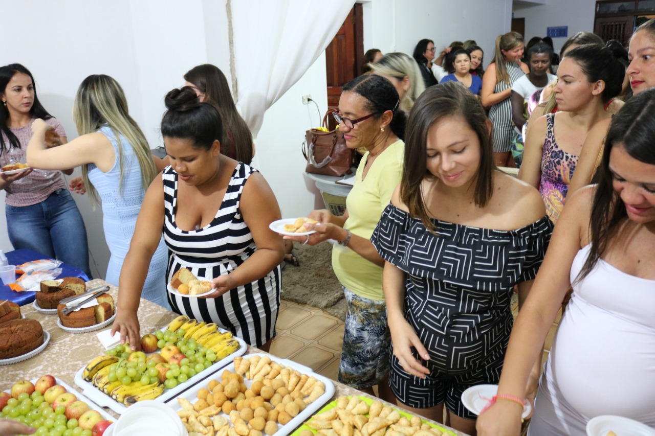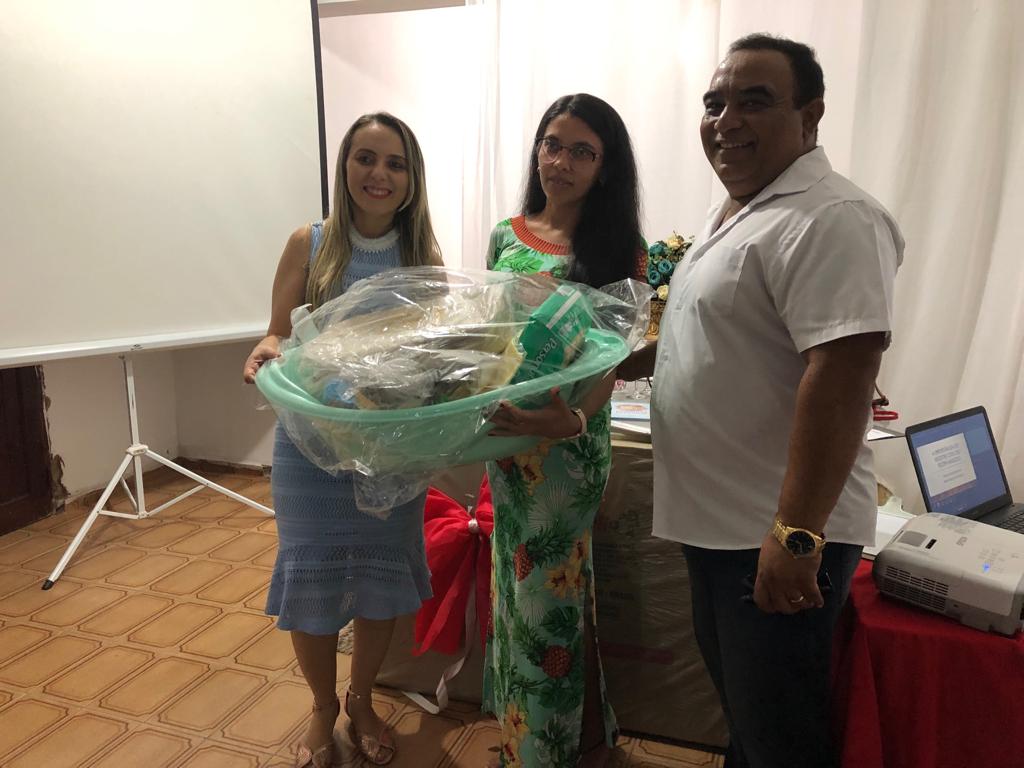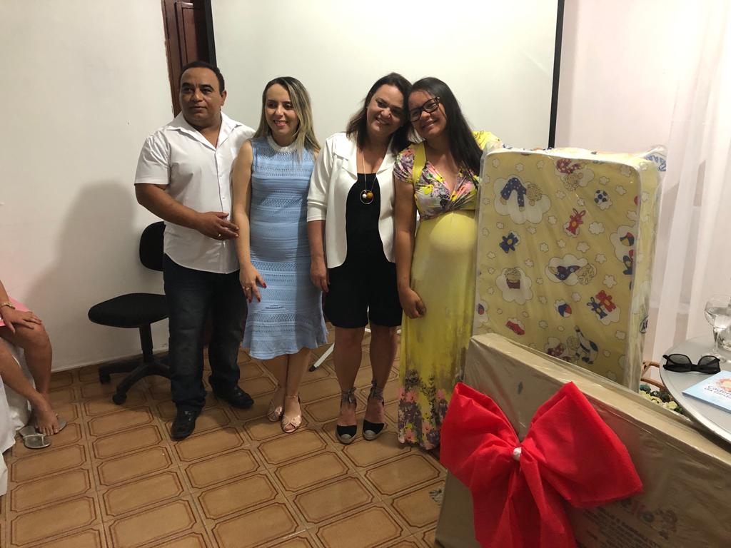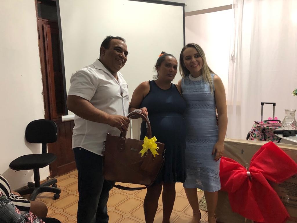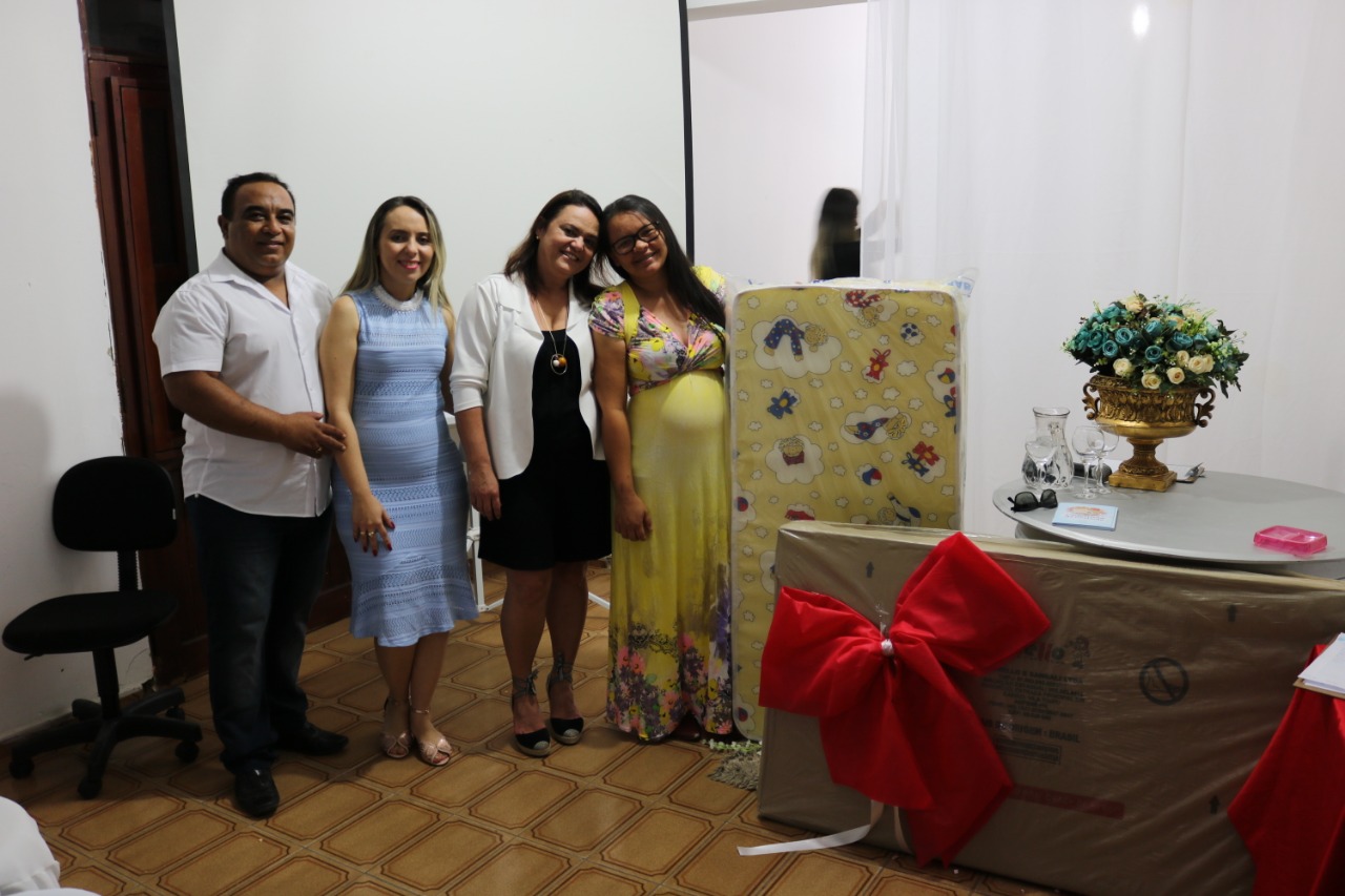 A Secretária de Ação Social Claudiana Alves e o Prefeito Marcos Eron realizaram a entrega de kits às gestantes, sorteios de brindes, berço, além de servir o café da tarde.
