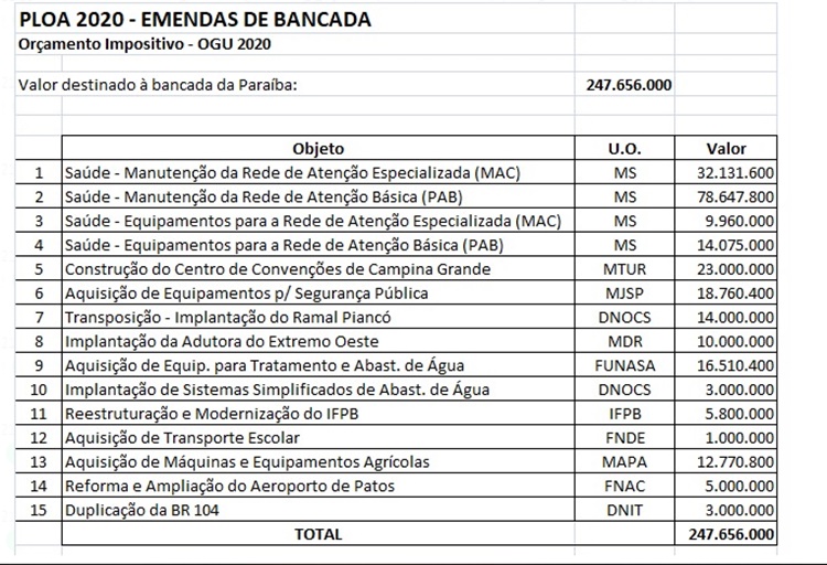 A Lei Orçamentária prevê receitas de R$ 247.656.000 milhões para o exercício financeiro de 2020 e de acordo com o deputado Efraim Filho os maiores investimentos foram destinados para saúde e segurança pública, incluindo nesta lista o Centro de Convenções em Campina Grande. “A bancada trabalhou de maneira coesa, madura e a união, na definição das prioridades para o Estado e municípios, resultou na divisão de recursos para obras estruturantes visando melhoria na qualidade de vida dos paraibanos”. Destacou Efraim.