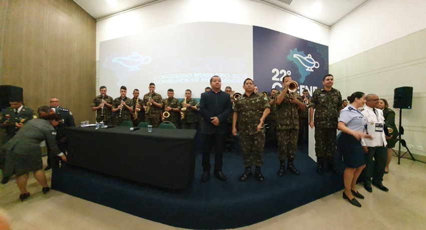 A apresentação do 34º Batalhão de Infantaria Mecanizada do Exército deu início ao II Encontro Nacional e I Encontro Internacional de Enfermagem Militar, nesta terça-feira (12). O evento, organizado pela Comissão Nacional de Profissionais de Enfermagem Militares do Conselho Federal de Enfermagem (CONPEM/Cofen), contou com a presença de forças nacionais e internacionais na cerimônia de abertura.