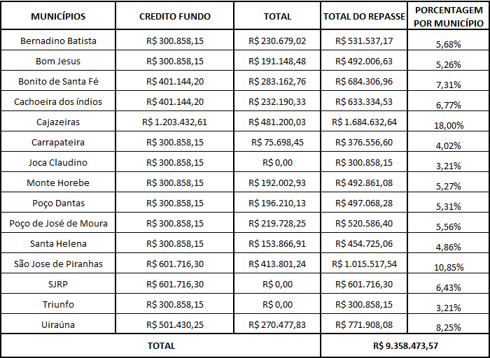 A Paraíba recebeu R$ 110,2 milhões, valor inferior aos R$ 123,4 milhões repassados em janeiro de 2019. O repasse para os 15 municípios da região de Cajazeiras foi de R$9.358.473,57.
