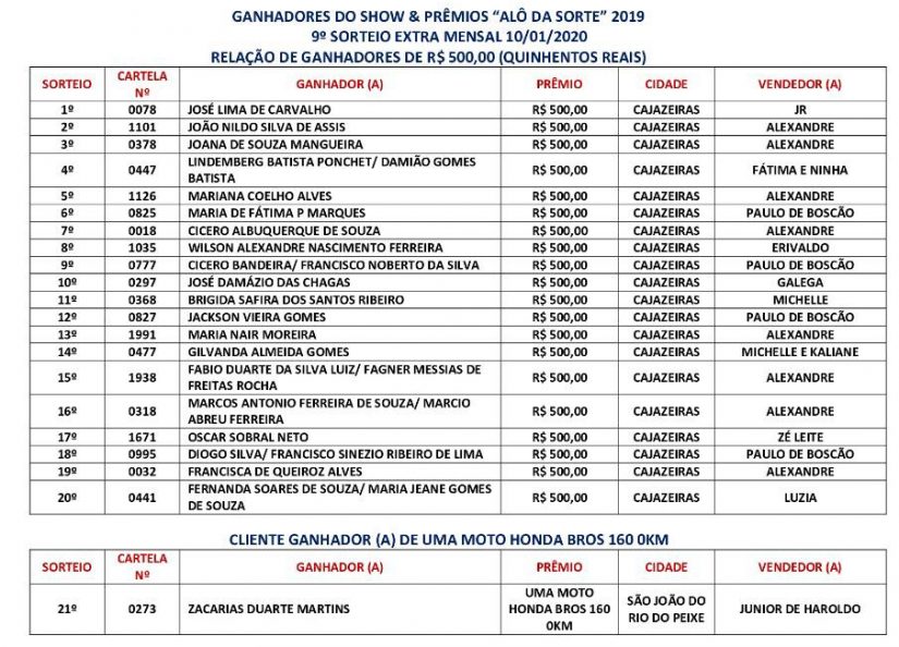 Ao todo, foram distribuídos vinte prêmios no valor de R$ 500,00 e sorteada uma motocicleta modelo Honda Bros 160 cilindradas. O ganhador da moto foi o senhor Zacarias Duarte Martins, da cidade de São João do Rio do Peixe. Zacarias esteve ao vivo no programa momentos após ter sido o vencedor do sorteio.
