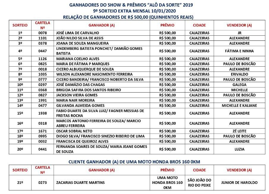 O Show & Prêmios Alô da Sorte realizou na última sexta-feira, 10, mais um sorteio extra mensal, o primeiro de 2020.