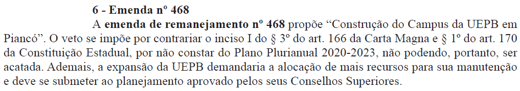 Em Piancó foram vetados dois projetos de lei. A construção do Campus da UEPB teve sua emenda vetada por contrariar a Constituição Estadual. Outro motivo seria que a expansão da UEPB demandaria a alocação de mais recursos para sua manutenção, com isso deve se submeter ao planejamento aprovado pelos seus Conselhos Superiores.