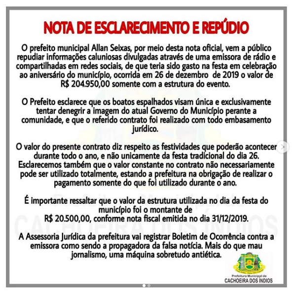 Na nota divulgada foi ressaltado que o valor gasto na festa em comemoração ao aniversário do município foi de R$ 20.500,00, conforme nota fiscal emitida em 31/12/2019. A assessoria jurídica da prefeitura afirma que irá registrar Boletim de Ocorrência contra a emissora por ‘propagar notícia falsa’.