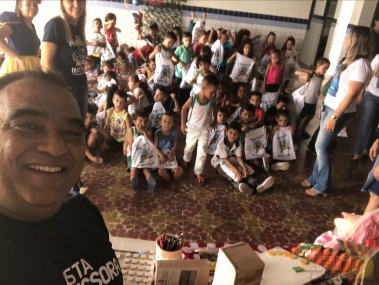 Os alunos da Escola Venâncio Dias com material que receberam do prefeito Marcos Eron
