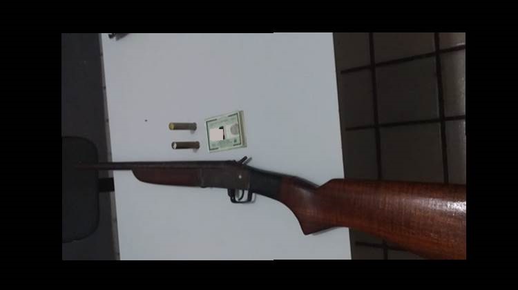 A guarnição foi ao local e localizou o suspeito de 43 anos sentado em uma cadeira com a espingarda calibre 28 ao lado, com dois cartuchos intactos.