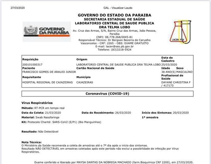Júnior Araújo comemorou aniversário na quinta-feira (26) e realizou a coleta no Hospital Regional de Cajazeiras no sábado, dia 21 de março, após queixar-se de sintomas gripais.