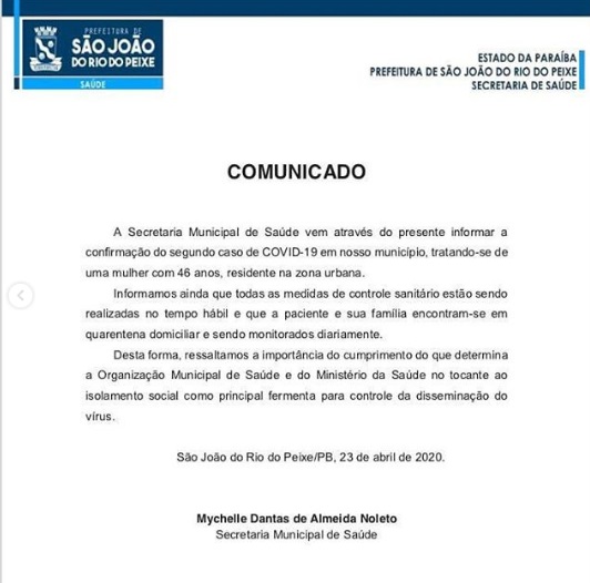 São João do Rio do Peixe registrou o primeiro caso no dia 14 de abril. De acordo com a secretária de saúde do município, Mychelle Nolêto em nota encaminhada ao Diário do Sertão informou que ”todas as medidas de controle sanitário e acompanhamento do caso foram realizadas em tempo hábil e que o paciente se encontra isolado em quarentena domiciliar por apresentar sintomas leves”.