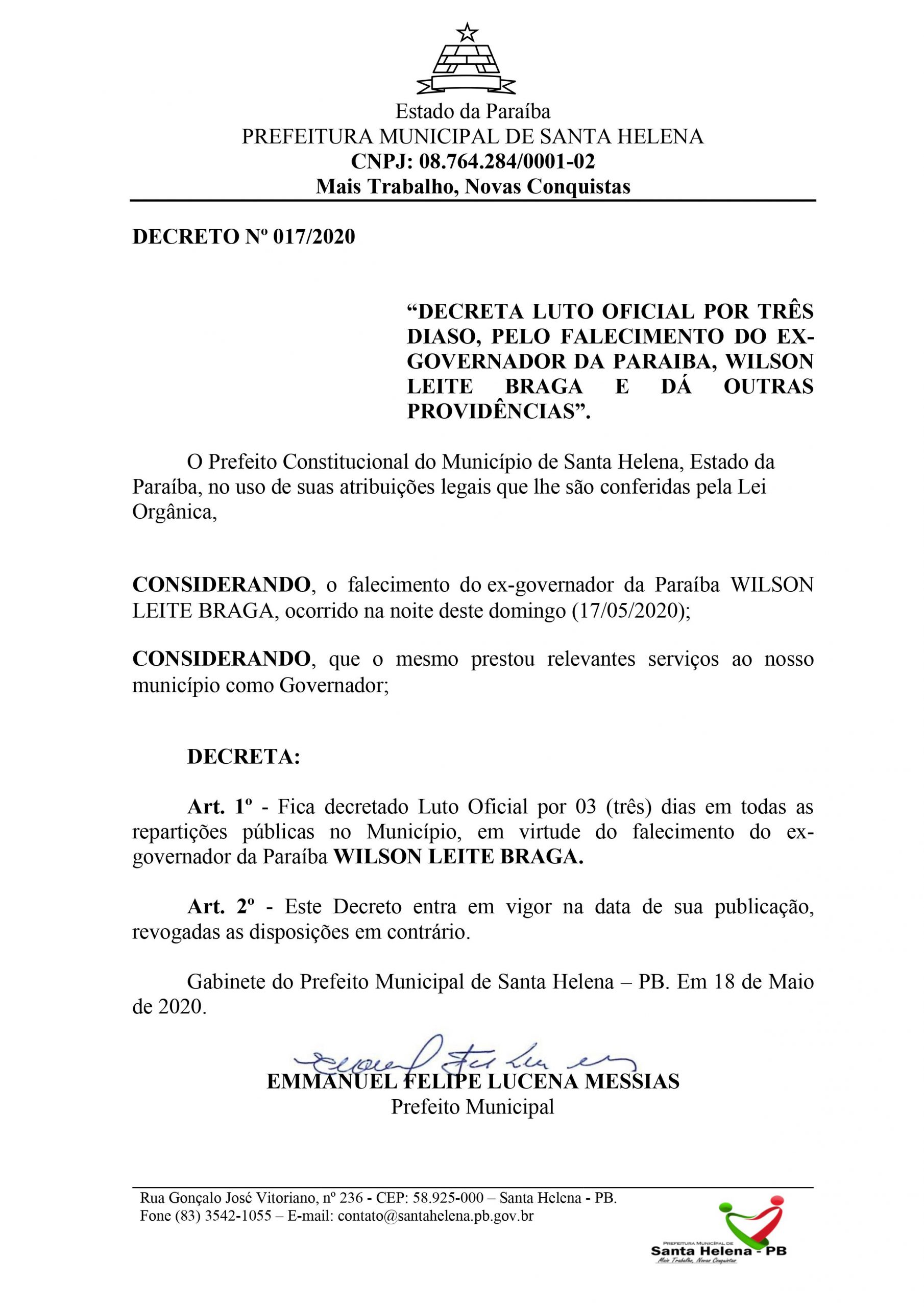 O prefeito Emanuel Messias, da cidade de Santa Helena, na região de Cajazeiras, sertão da Paraíba, decretou luto oficial por três dias, em virtude do falecimento do ex-governador da Paraíba, Wilson Leite Braga.