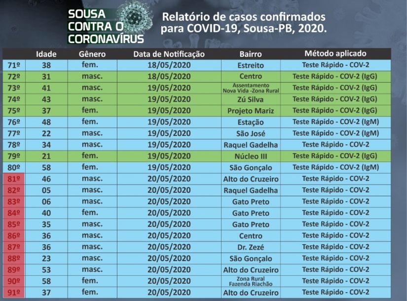 Os casos de coronavírus continuam aumentando na cidade de Sousa. Segundo o Boletim Epidemiológico divulgado pela secretaria Em apenas 24 horas já foram registrados mais 11 casos da COVID-19.