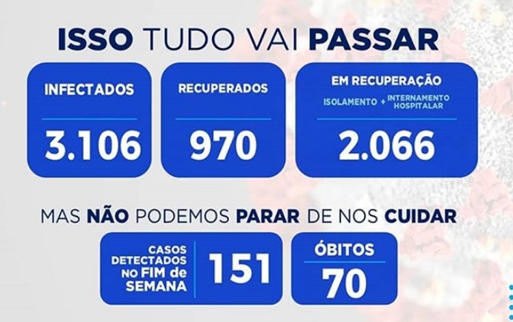 A secretaria de saúde divulgou nesta segunda-feira (03), que o município de Patos chegou aos 3.106 casos do novo coronavírus. Desse total de infectados, 2.066 estão em recuperação, 970 estão recuperados, além de 70 óbitos, e 151 novos casos neste fim de semana, uma média de 50 casos por dia.
