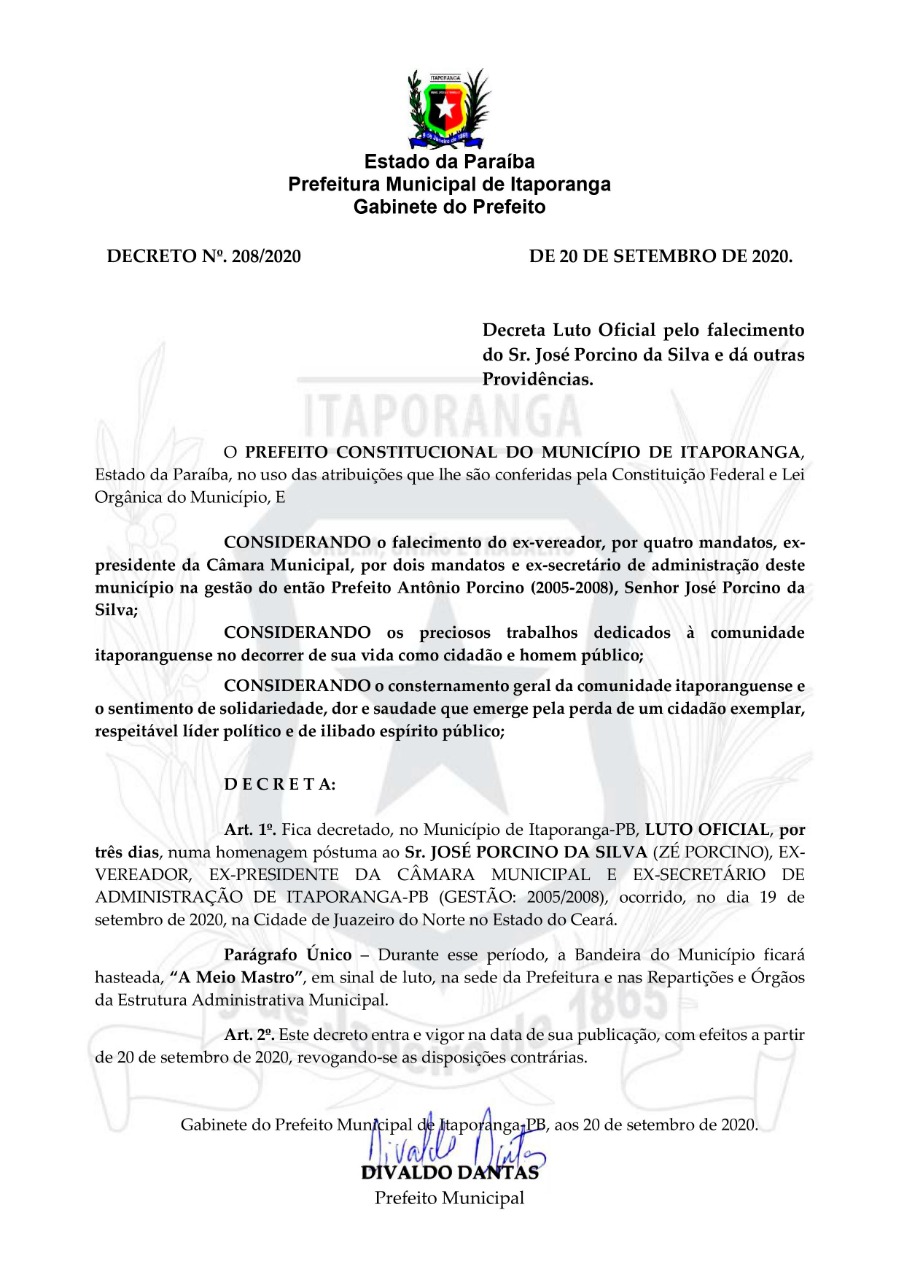 O ex-vereador da cidade de Itaporanga, no Vale do Piancó, sertão da Paraíba, José Porcino da Silva, de 67 anos, faleceu na noite deste sábado (19), em um hospital da cidade de Juazeiro do Norte, no Ceará, em decorrência de complicações da Covid-19.