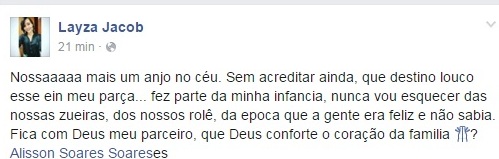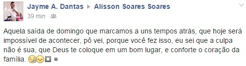 Na página do Facebook, amigos do rapaz se dizem inconformados com a partida prematura de Alisson Soares. Eles deixaram homenagens e palavras de conforto a família do jovem.