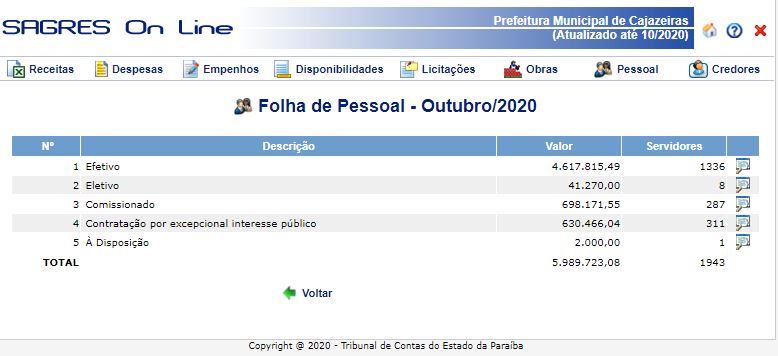 Ainda de acordo com Sagres, em janeiro deste ano a folha de pessoal da prefeitura de Cajazeiras com 1.680 servidores custava R$ 5.213.344,95. Em outubro, mês da última atualização do Sagres do TCE, desse ano, a prefeitura tinha 1.943 servidores, e os valores pagos com a folha, chegou a quase 6 milhões, o total de R$ 5.989.723,08.