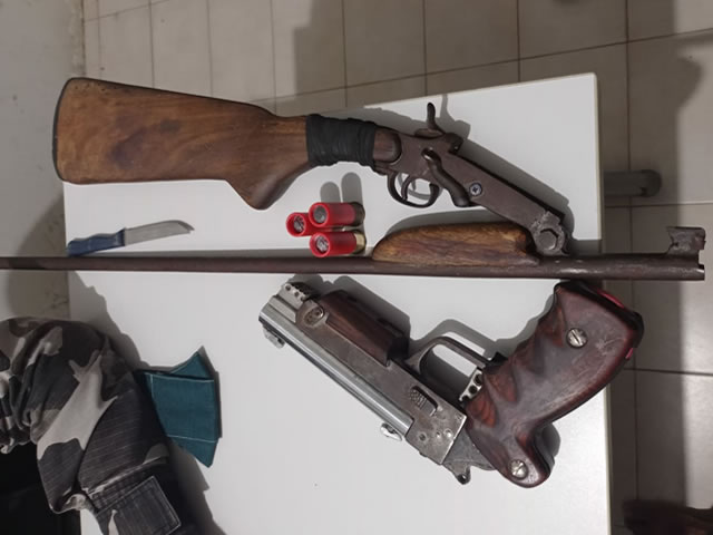 Após um cerco policial, o suspeito identificado como sendo ex-presidiário, foi detido e com ele apreendido duas armas, sendo uma pistola adaptada para munições calibre 12m, uma espingarda calibre 36 e uma faca.