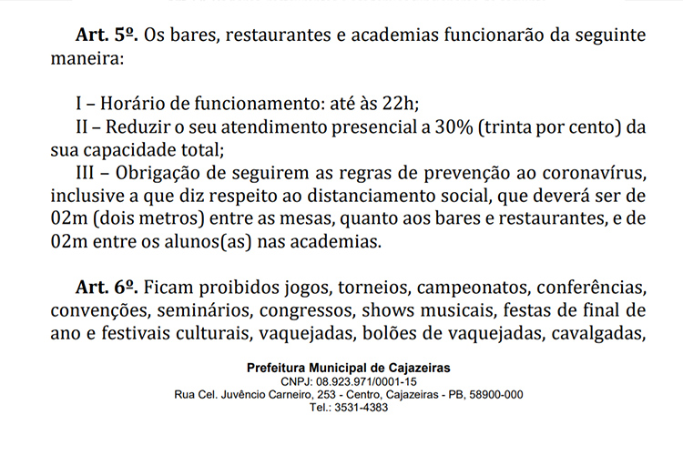Em novo decreto a prefeitura de Cajazeiras, no Sertão da Paraíba, restringiu o horário de funcionamento de bares, restaurantes e academias. A partir desta segunda-feira (14), o horário de funcionamento será até as 22h00. Além disso, os estabelecimentos desse três segmentos devem funcionar apenas com 30% da capacidade.