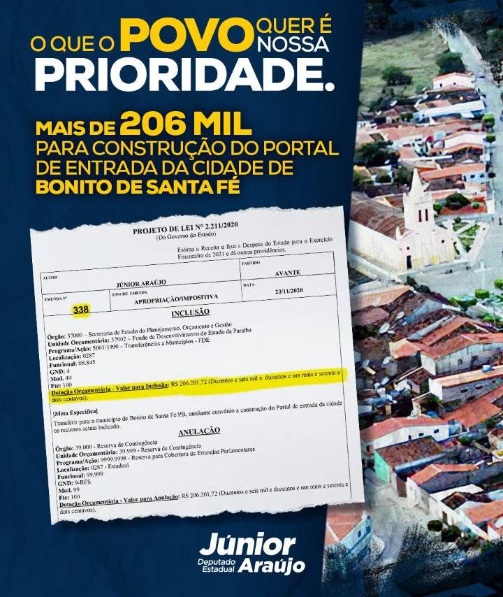 O deputado estadual Júnior Araújo (Avante) anunciou nesta segunda-feira (18) a destinação de uma emenda individual impositiva no valor de R$ 206.201,71para construção de um portal na entrada da cidade de Bonito de Santa Fé, na região de Cajazeiras, sertão paraibano.