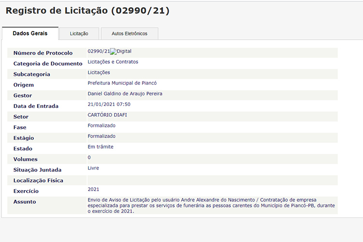 De acordo com o documento publicado no site da prefeitura o objetivo da licitação na modalidade Pregão Eletrônico de número 00007/2021 é para a “Contratação de empresa especializada para prestar os serviços de funerária as pessoas carentes do Município de Piancó-PB, durante o exercício de 2021.”