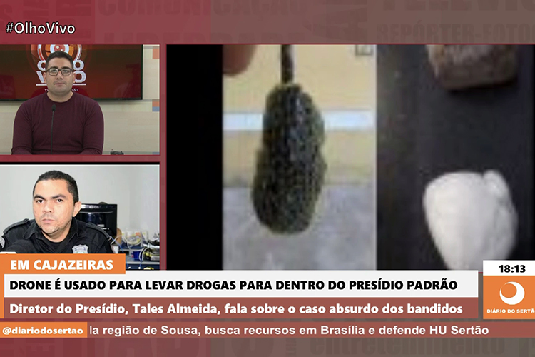 A Polícia Penal apreendeu na noite da última quarta-feira (3), um pacote com entorpecentes que foi deixado por um drone, no pátio do Presídio Padrão de Cajazeiras, no Sertão da Paraíba. Em entrevista ao programa Olho Vivo da TV Diário do Sertão, o diretor do presídio Tales Almeida, disse que os policiais que estavam de plantão não conseguiram apreender o equipamento que se movimentou muito rápido próximo a unidade prisional.