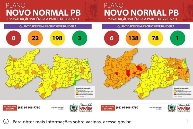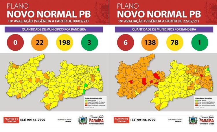 Nessa nova avaliação, 62% dos municípios paraibanos encontram-se em bandeira laranja, esboçando um crescimento expressivo de 527% em relação à 18ª avaliação, na qual cerca de 10% dos municípios encontravam-se nesta bandeira. Até a análise anterior, a Paraíba não tinha cidades em bandeira vermelha. Já na avaliação atual, que passa a vigorar nesta segunda-feira (22), os municípios de Igaracy, Catingueira, São José do Bonfim, São Mamede, Cuité de Mamanguape e Cacimbas compõem os 2,4% de localidades classificadas em vermelho, com recomendação de restrição de mobilidade e serviços.