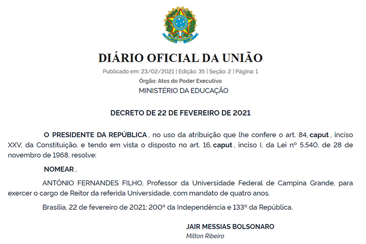 O professor Antônio Fernandes natural de Uiraúna, cidade da região de Cajazeiras, no Sertão paraibano, foi nomeado pelo presidente Jair Bolsonaro para o cargo de reitor da Universidade Federal de Campina Grande (UFCG). O decreto foi publicado nesta terça-feira (23), no Diário Oficial da União (DOU).