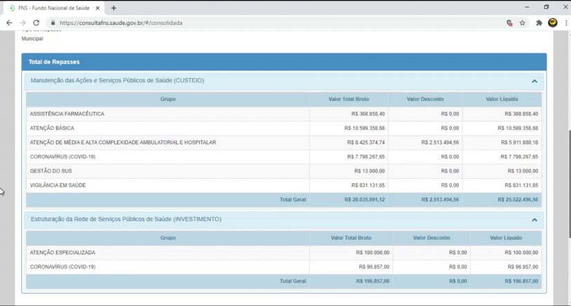 Em 2020, no total de todos os recursos transferidos pelo Ministério da Saúde foram R$ 28.232.848,12 milhões.