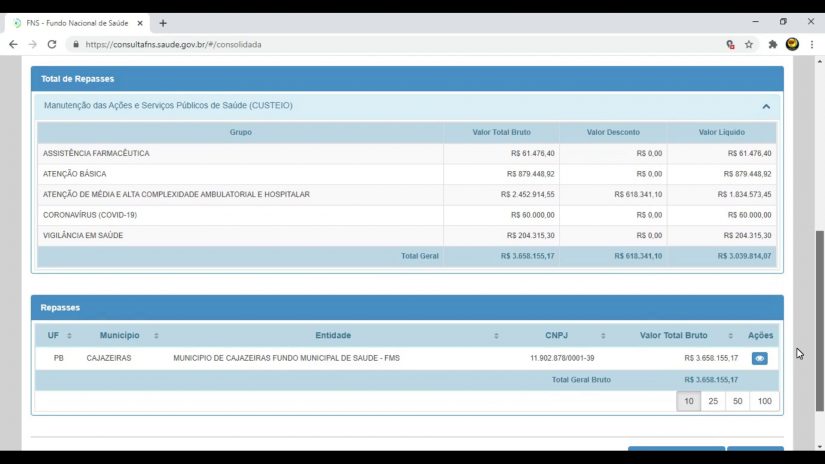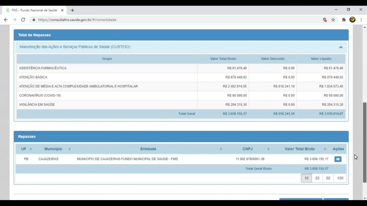 De acordo com os dados da disponíveis na plataforma do Fundo Nacional de Saúde (FNS) do Ministério da Saúde, a prefeitura de Cajazeiras, no Sertão da Paraíba, recebeu mais de R$ 30 milhões durante o ano de 2020 e os dois primeiros meses de 2021.