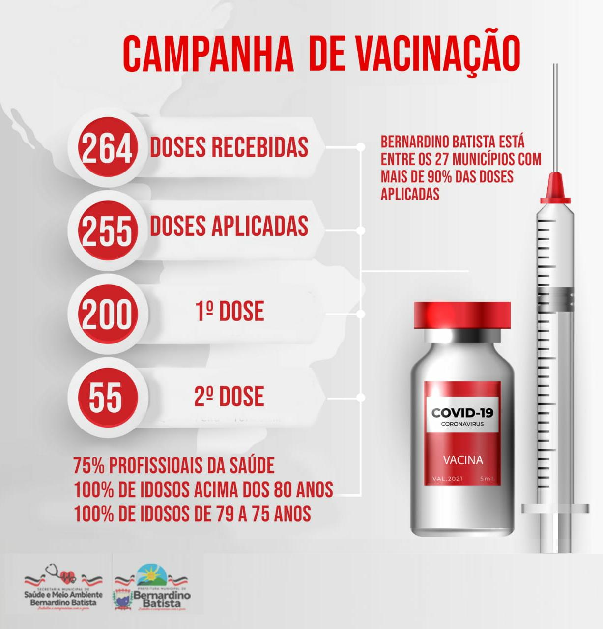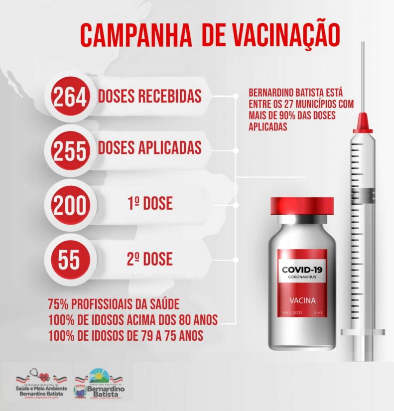 Em entrevista a uma rádio local, secretária de Saúde de Bernardino Batista, Ruth Rany, afirmou que o município está com 75% dos profissionais de saúde vacinados, 100% de idosos acima 80 anos e também o grupo de 79 a 75 anos. “Bernardino está entre os 27 municípios com 90% de doses aplicadas, o município atingiu 96,59% de cobertura, de acordo com dados do Ministério da Saúde de 15 de março de 2021”, detalhou.