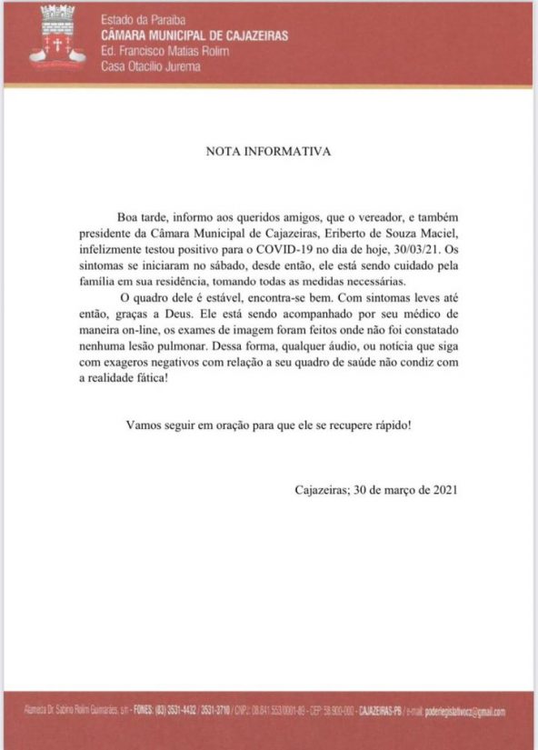 O presidente da Câmara de Cajazeiras, vereador Eriberto Maciel (PP) foi diagnosticado com coronavírus nesta terça-feira (30). O exame foi realizado, após o parlamentar sentir alguns sintomas característicos da doença desde o último sábado (27).
