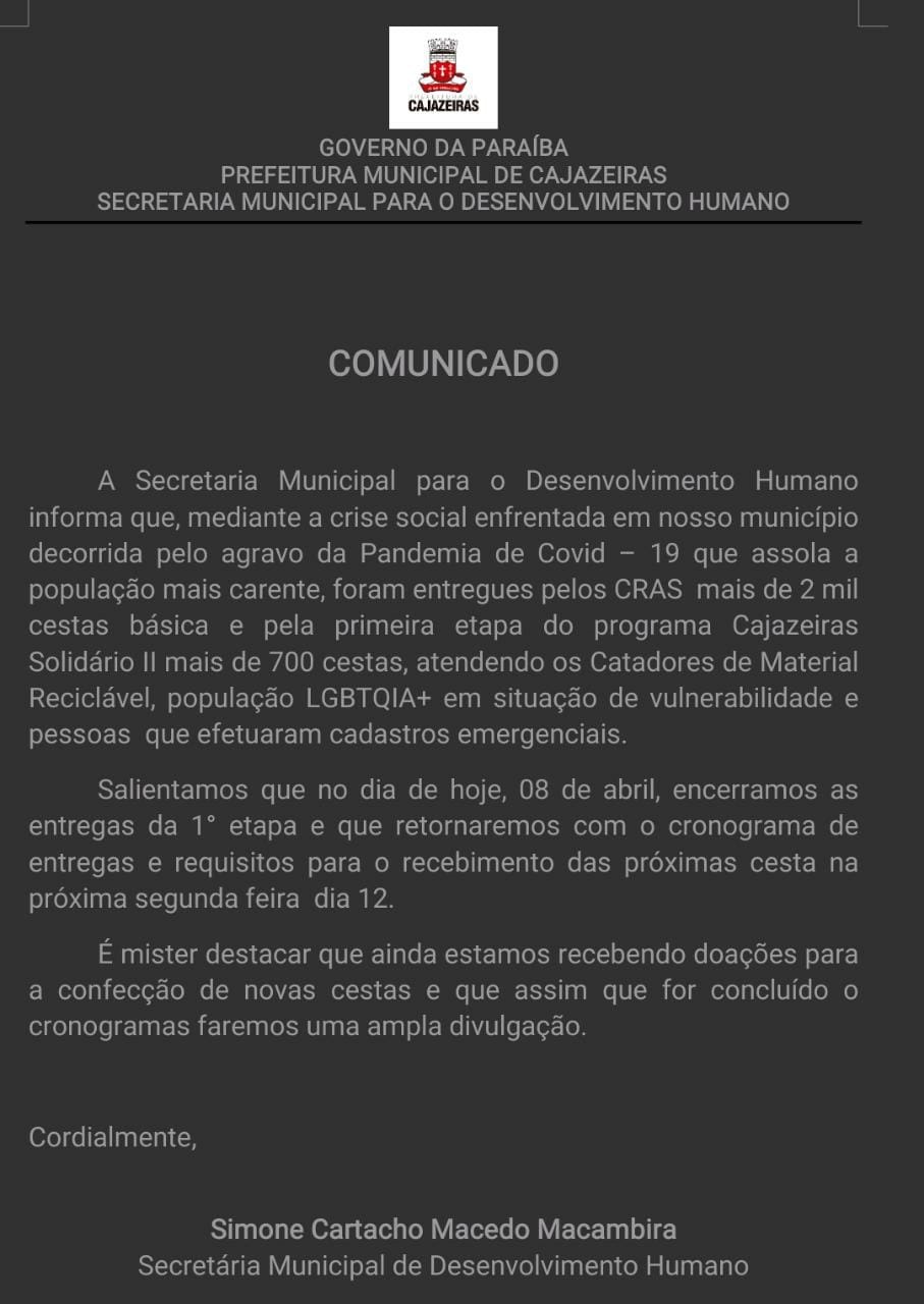 A assessoria de comunicação da Secretaria de Desenvolvimento Humano, se manifestou através de nota e disse que as cestas foram entregues dentro do cronograma de distribuição da campanha Cajazeiras Solidária II em sua primeira etapa e que a distribuição terá prosseguimento na próxima segunda-feira, dia 12.