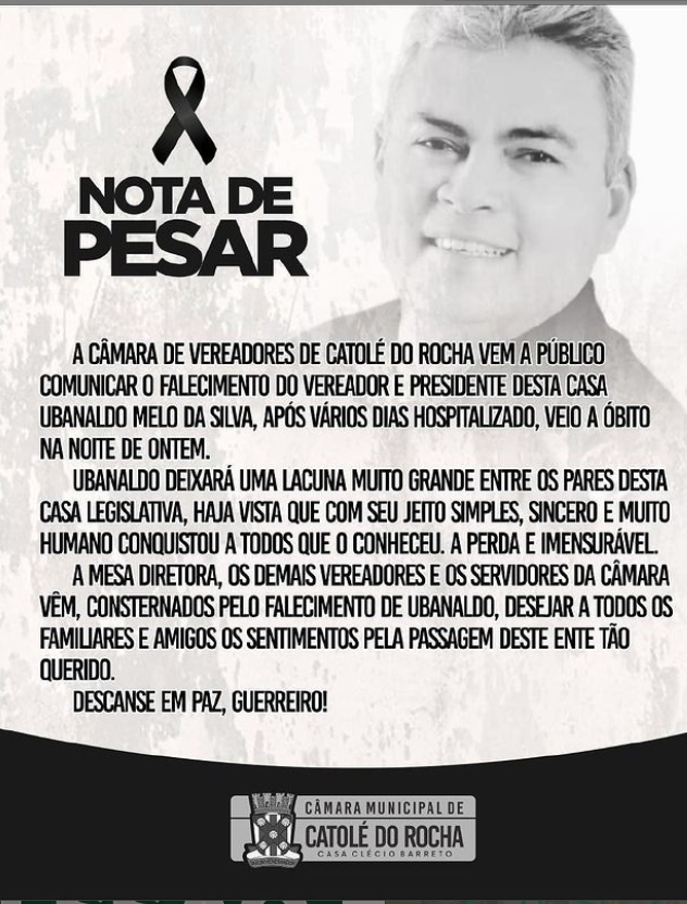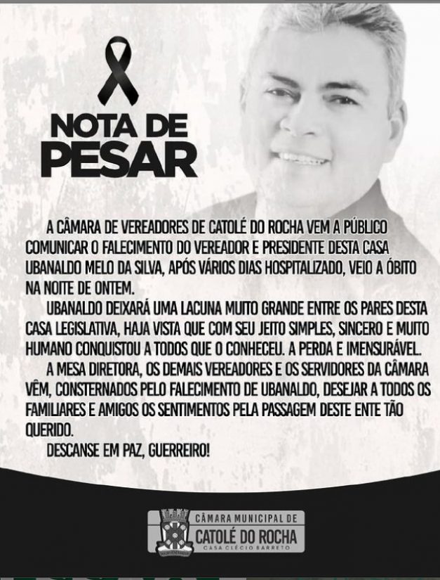 A Câmara Municipal de Catolé do Rocha publicou uma nota de pesar na manhã deste domingo, lamentando a morte do parlamentar. “A mesa diretora, os demais vereadores e servidores da Câmara, vêm consternados pelo falecimento do Ubanaldo, desejar a todos os familiares e amigos os sentimentos pela passagem deste ente tão querido”, foi escrito na nota.