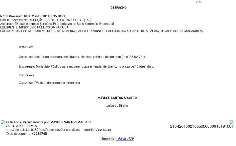 O despacho da juíza determina a notificação do Ministério Público para no prazo de 10 (dez) dias, requerer no que entender de direito sobre a penhora de um bem, que no caso foi um veículo Ford Rager no valor de R$ 111 mil de propriedade do prefeito de Cajazeiras, José Aldemir Meireles de Almeida (PP) e da deputada estadual, Paula Francinete Lacerda (PP), nos autos de uma ação de execução de título executivo extrajudicial que está em tramitação.
