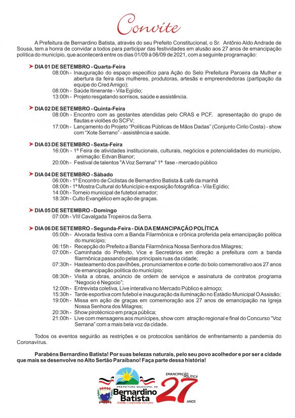 A Prefeitura de Bernardino Batista, através do prefeito Aldo Andrade, do vice-prefeito Mateus Gomes, vereadores e secretários municipais, convida a população para as festividades alusivas aos 27 anos de emancipação política do município, que irão acontecer dos dias 01 a 06 de setembro de 2021.