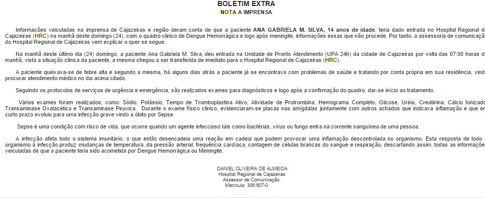 Faleceu neste domingo (24), no Hospital Regional de Cajazeiras (HRC), a adolescente Ana Gabriela Silva, 14 anos, com suspeita de dengue hemorrágica.