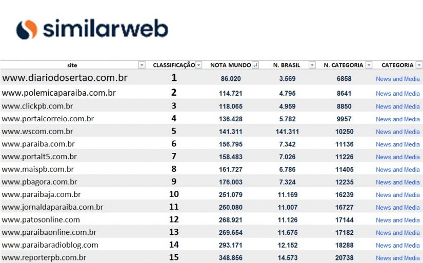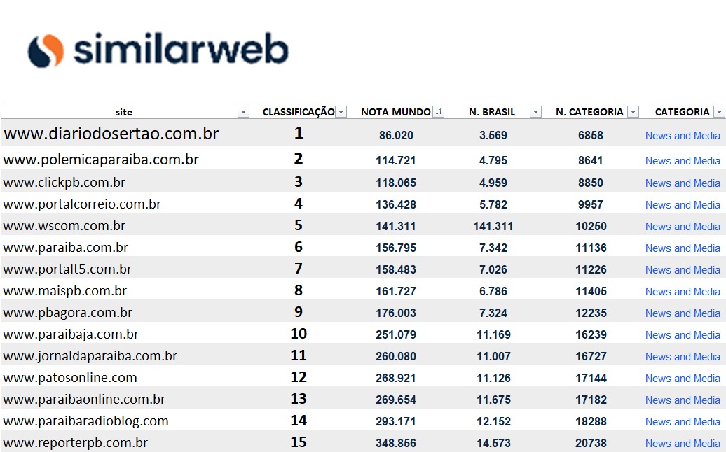 Os dados são referentes até o dia 30 de novembro de 2021. Segundo o SimilarWeb o Diário do Sertão é primeiro lugar na Paraíba e está entre os mais acessados do Nordeste brasileiro.