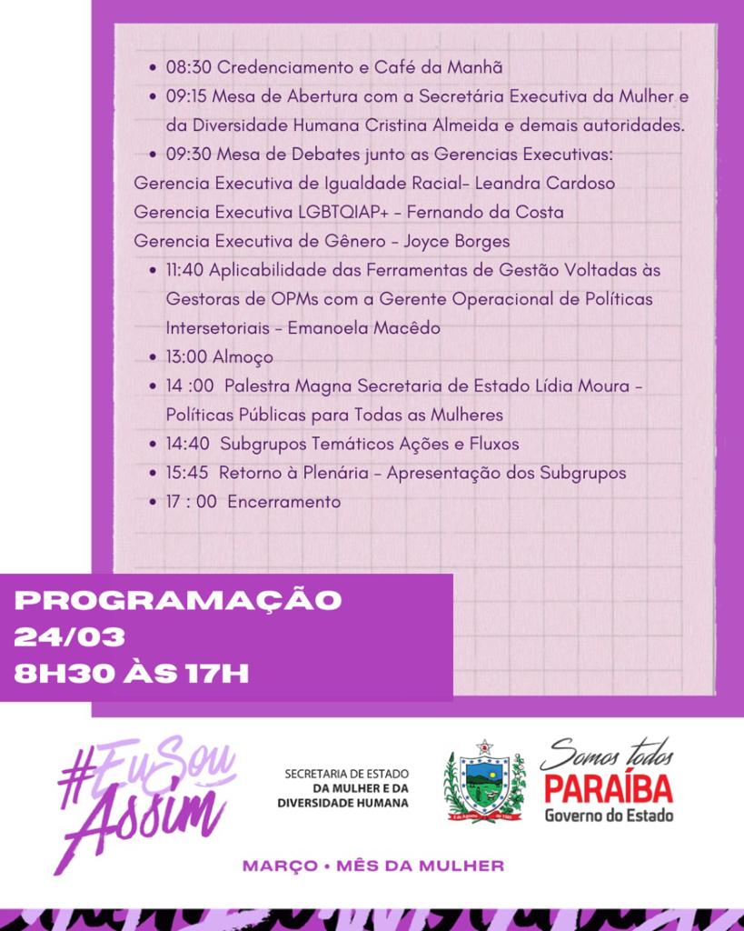 A Secretaria de Estado da Mulher e da Diversidade Humana promoveu nesta quinta-feira (24), na capital João Pessoa, um Seminário de grandes perspectivas com o tema: “Políticas Públicas para Todas as Mulheres”, celebrando o mês da mulher, que aplica a compilação da mulher segura e livre na atual sociedade brasileira, usando a temática “#EUSOUASSIM#, denominando espaço e poder da estrutura feminina dentro de todos os âmbitos aderidos por elas mesmas.