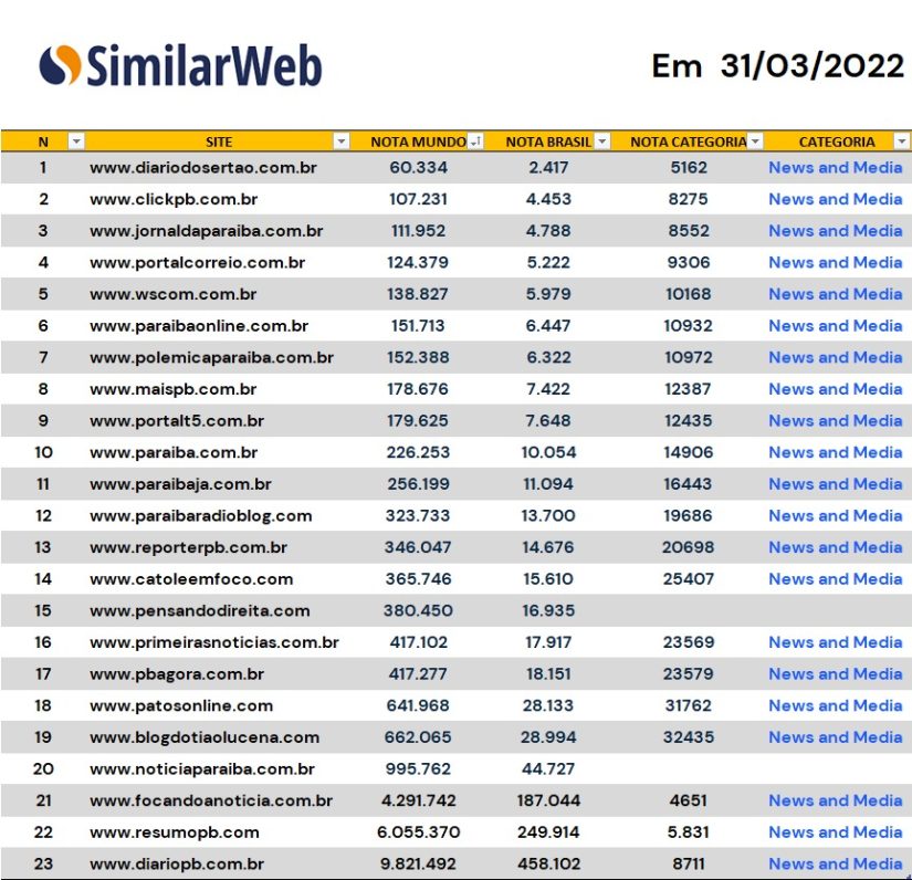 Os dados são referentes ao período até dia 31 de março de 2022. Segundo o SimilarWeb, o Diário do Sertão ficou em primeiro lugar na Paraíba e está entre os mais acessados do Nordeste.